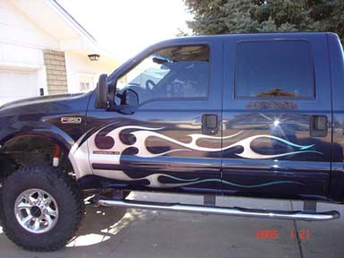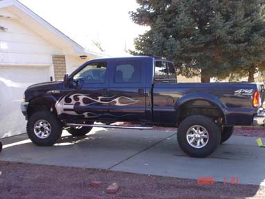 The F350 is a Lariat 7.3 Power Stroke turbo diesel, automatic transmission, 4" Exhaust, K&N Air intake, Edge with attitude Monitor, 6" lift . 37X12.50R17 Goodyear MTRs, Eagle Series 118 17" wheels , Posi in rear w/ custom paint by Montoya Graphics..
