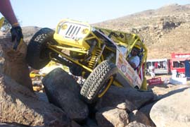 | The 2004 She-J II , as we like to call it, Started with Advanced Frame Works TJ Frame rails, a LT-1 350HP engine built by S&S engines, 700R4 automatic transmission with winters shifter. Hedman Snug fit hedders, Painless wiring harnes for the LT1 and 8-Circuit breaker protected toggle switch panel, The transfer case is an Atlas II Highlander. The rollcage was designed by Jim Petersen, The front differential is a shaved Dana 60R out of a F350 with an ARB Air Locker, Dodge outer knuckles and disk brakes, Motive Performance 5:13 gears and 35 spline axles. The rear differential is a shaved Ford 9" with a ARB Air Locker, 35 spline inner axles, CTM's Dana 60 U-Joints, CTM's 33 spline Dodge outer axles, Motive Performance 5:13 gears and disc brakes.Custum Drive lines by Tom Wood's custom Drive Shafts, The suspension consists of 2.5" TJ coil springs front and rear, 3 link in the front and four link suspension in the rear, Early Bronco Steering box that was Redone by AGR to fit AGR's Power steering pump and Rock Ram Hydraulic Assisted Front Steering System, Sway-a-Ways 2" 12" travel Race-Runner shocks. It also has 17" bead locked Allied Rock-A-Thon Steel wheels, 37x12.5 R17 Goodyear MT/R , and a Ramsey Platinum 6000 Winch, Team She-J Own Fiber glass 48" TJ Hood and Fiber glass Cowls, Custom tonneau cover made by Rock Gear Inc. | |